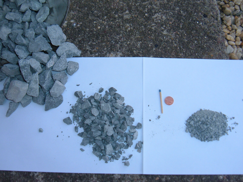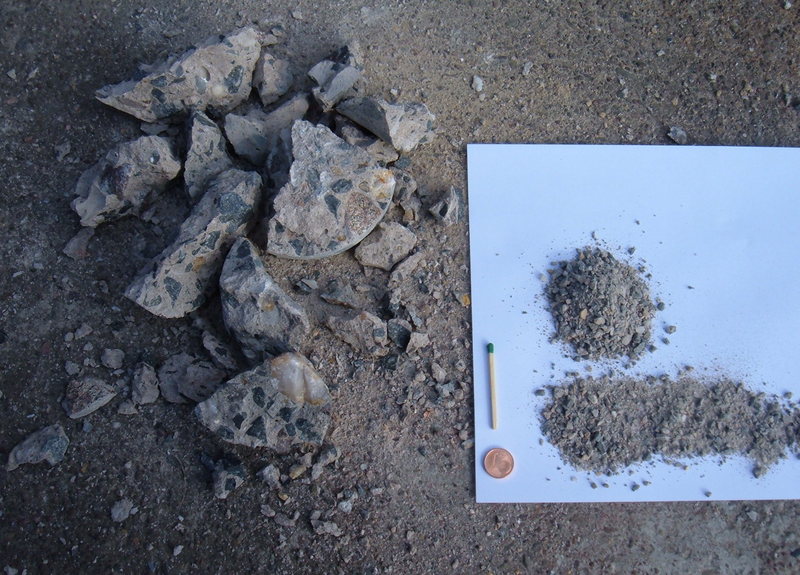 As a matter of principal, for the eluate, the grain size should be used which corresponds with the additional utilization. Since chunks of concrete like in the photo can not be analyzed though, one has to assume approximately 10 mm for assessments, for other tests analytically fine samples are to be used. According to the commercial waste ordinances, a fineness of below 0,2 mm is to be assumed. Is a material with a grain size of 10 mm needed, in the first run a large amount of material is broken up. The distance of the crushing jaws is therefore adjusted accordingly wide. The for the determination of the eluatable materials required shares are sampled. For the analysis it shall be referred to DIN 38414, part 4 of the so called DEV S4-procedure. The remainder of the material is again processed with the smallest gap width of the jaw crusher. The grains are below 3 mm now.