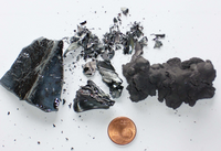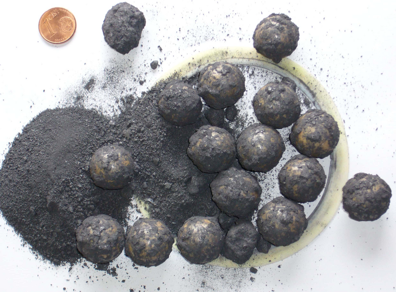 After a processing of 5 minutes at a maximum rotational speed (650 rpm), it was assessed and exactly as expected, a fine powder with several, few rough chunks was found. On the photo those are seen next to the coin (comparison of size) and on the lower rim of the photo. These chunks were sorted out and the remaining sample was ground further.